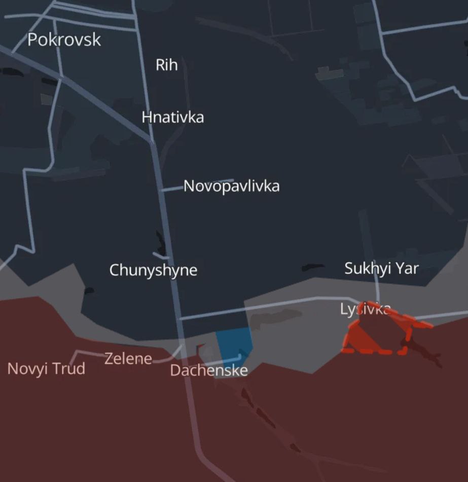 7.55 Російські війська просунулися на південь від Покровська в Лисівці, повідомляє військовий паблік Deep State.