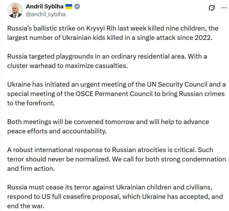 Україна ініціювала термінове засідання Ради безпеки ООН та спеціальне засідання Постійної ради ОБСЄ після балістичного удару по Кривому Розі.