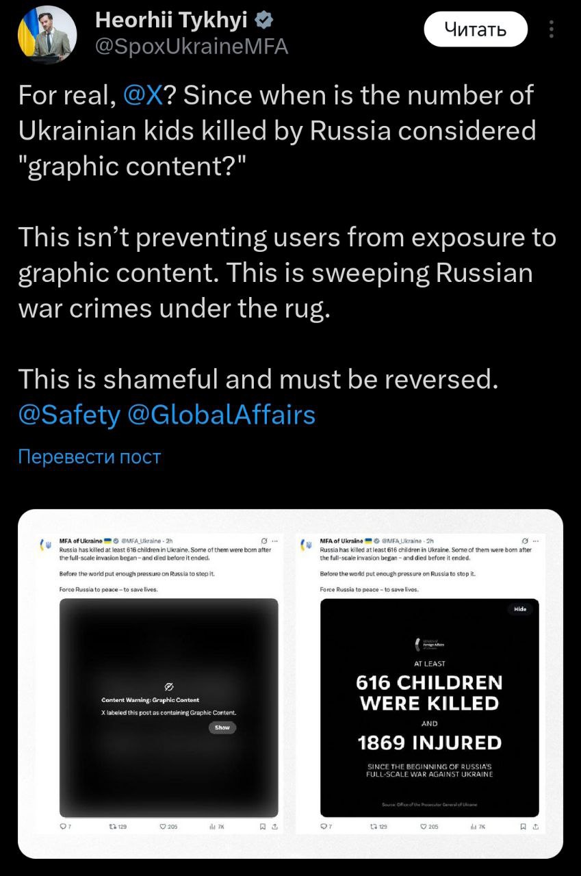 "Серйозно, X? З того часу кількість українських дітей, убитих росією, вважається "шокуючим контентом"? Це не про захист користувачів від жорстких зображень. Це - замовчування військових злочинів Росії", - написав Тихий.