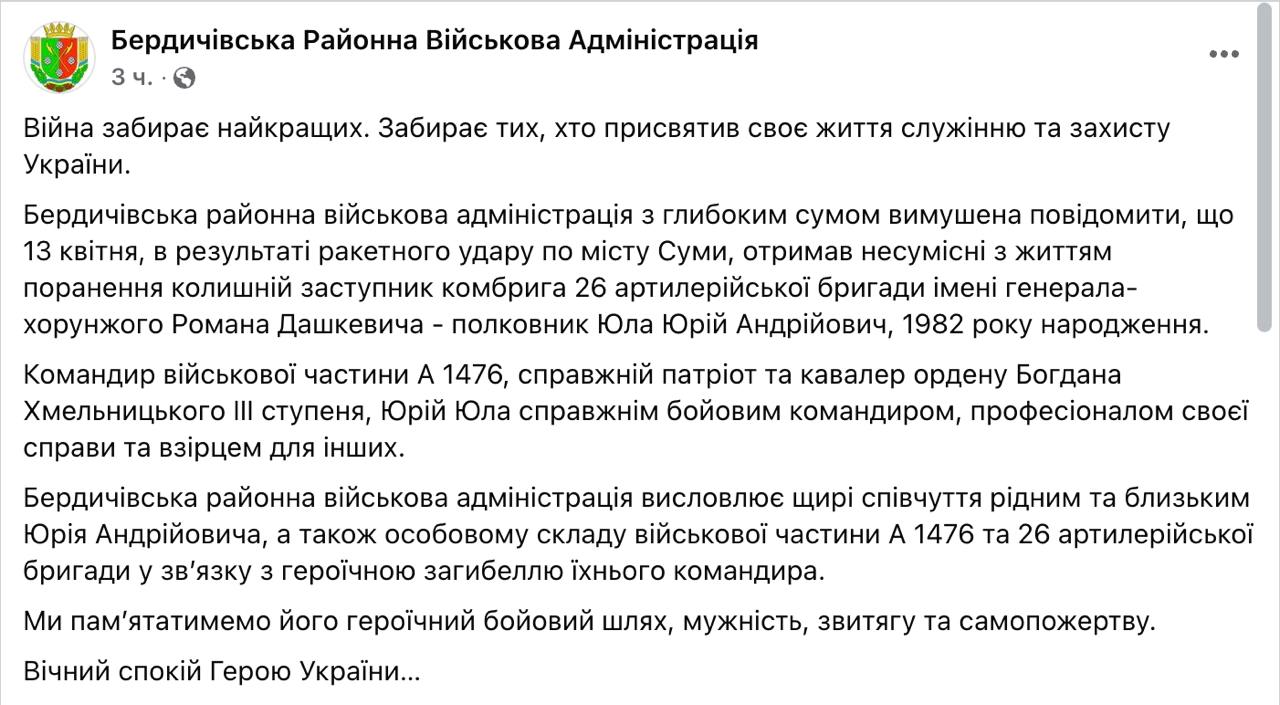 11:36 У Сумах внаслідок вчорашнього ракетного удару РФ загинув заступник комбригу 26 артилерійської бригади полковник Юла Юрій Андрійович.