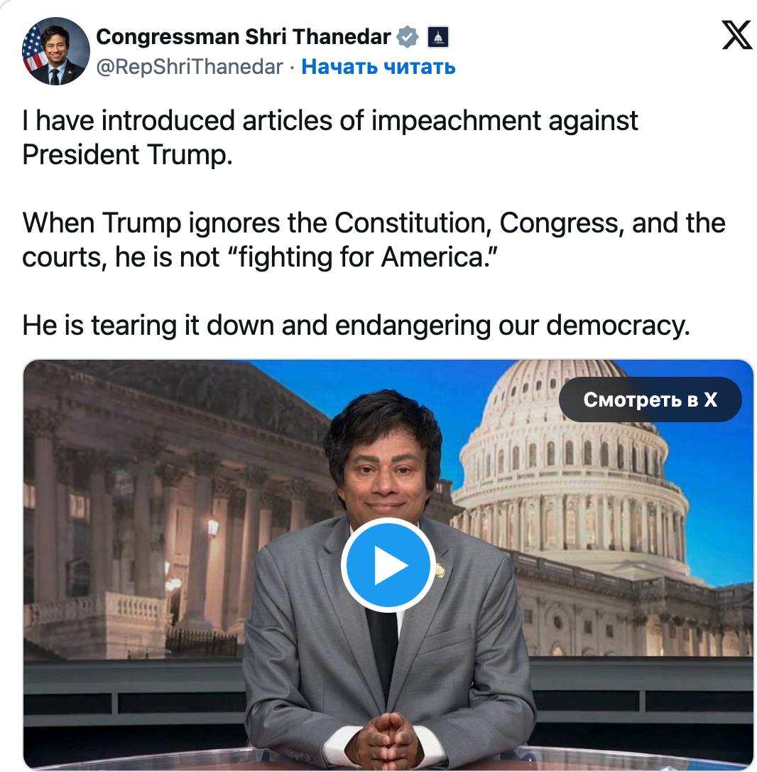 При цьому глава демократів Конгресу Хакім Джефріс заявив, що поки що навіть не читав звинувачень Тханедара.
