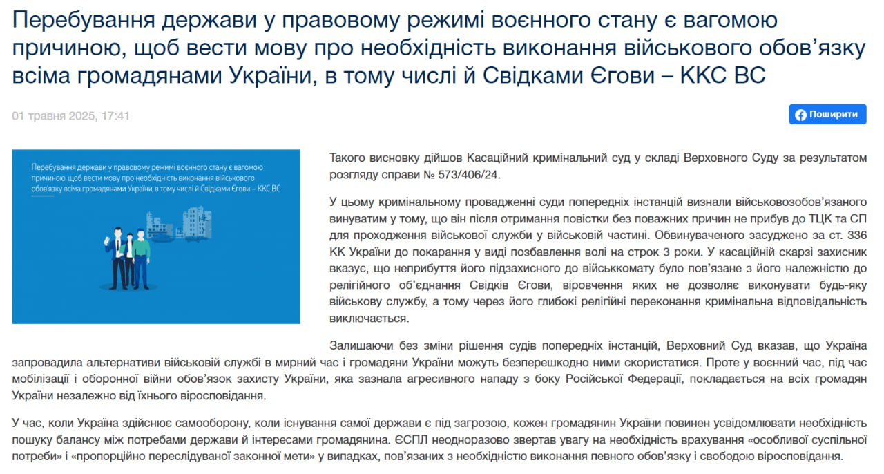 Суд розглянув кримінальне провадження, в якому суди попередніх інстанцій визнали військовозобов'язаного винним у тому, що після отримання повістки він без поважних причин не прибув до ТЦК для проходження військової служби. Обвинуваченого засудили за ст. 336 Кримінального кодексу України та позбавили його волі на 3 роки. У касаційній скарзі його адвокат зазначив, що підзахисний не з'явився до військкомату, оскільки є членом громади Свідків Єгови, чиє віровчення не дозволяє перебувати на військовій службі. А тому через його релігійні переконання кримінальна відповідальність виключається.