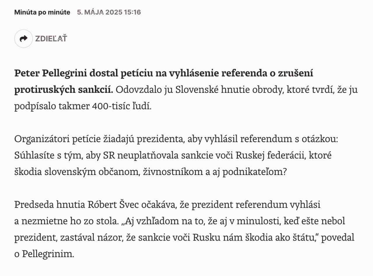 Президенту Петеру Пеллегріні пропонують оголосити референдум із запитанням: "Чи згодні ви з тим, що Словацька Республіка не повинна застосовувати санкції проти Російської Федерації, які завдають шкоди громадянам, торговцям та підприємцям Словаччини?"