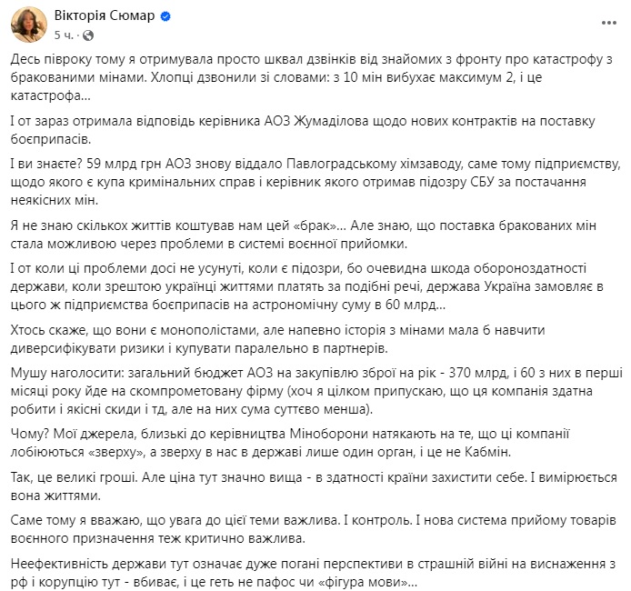 "І ви знаєте? 59 мільярдів гривень АОЗ знову віддало Павлоградському хімзаводу - саме тому підприємству, щодо якого є купа кримінальних справ та керівник якого отримав підозру СБУ за постачання неякісних мін", - написала Сюмар.