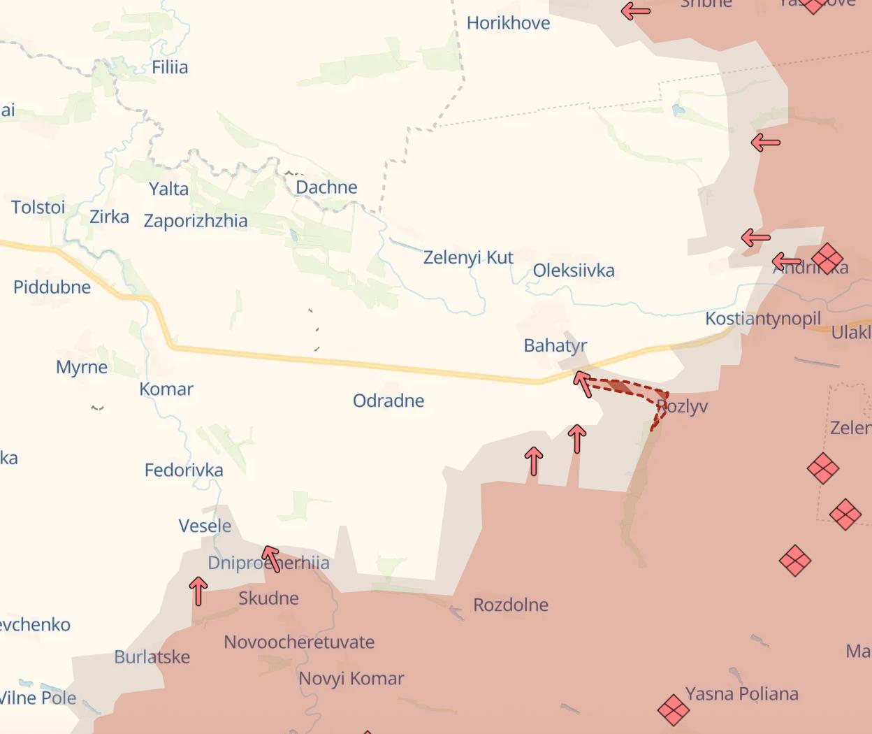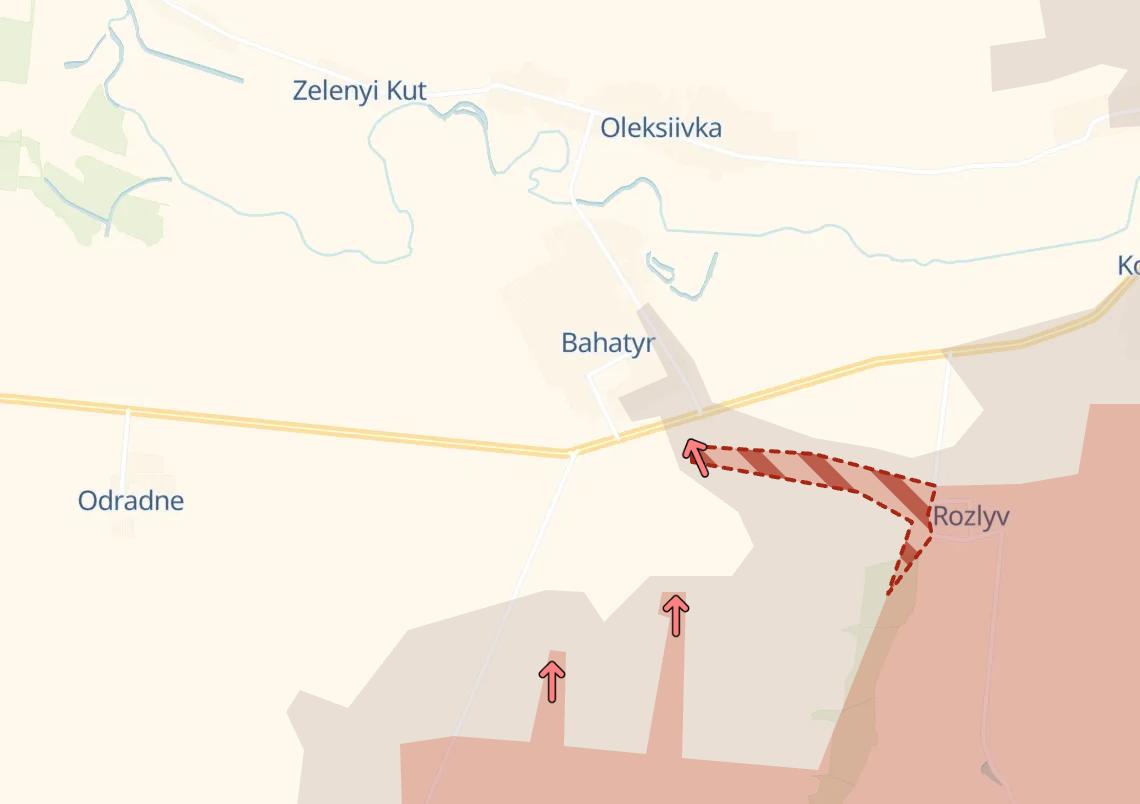 За інформацією онлайн-карти Deep State, за минулу добу зафіксовано просування РФ до Богатиря з боку Розливу та розширення сірої зони в самому селі.