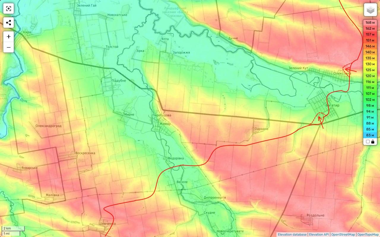 Судячи з карт, після Богатиря для російської армії відкривається шлях на 13 кілометрів уперед без населених пунктів - до сіл Ялта та Запоріжжя, звідки трохи більше ніж кілометр до кордону Дніпропетровської області.