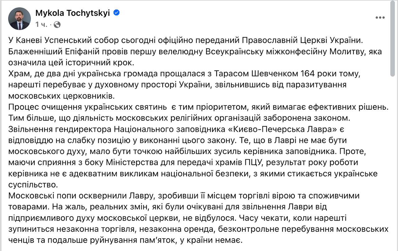 "Процес очищення українських святинь є пріоритетом, який вимагає ефективних рішень. Тим більше що діяльність московських релігійних організацій заборонена законом. Звільнення гендиректора Національного заповідника "Києво-Печерська лавра" є відповіддю на слабку позицію у виконанні цього закону. Те, що в лаврі не повинно бути московського заповідника Проте за сприяння з боку міністерства для передачі храмів ПЦУ результат року роботи керівника не є адекватним викликам національної безпеки, з якими стикається українське суспільство", - написав Точицький.