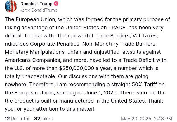 "Європейський Союз, який був створений з основною метою отримання вигоди з торгівлі зі США, виявився дуже складним партнером. Їх потужні торгові бар'єри, податки на додану вартість, безглузді корпоративні штрафи, немонетарні торгові бар'єри, маніпуляції з валютою, несправедливі і необґрунтовані судові позови в розмірі більш як 250 000 000 доларів на рік, що є абсолютно неприйнятним. Наші переговори з ними ні до чого не призводять! Тому я рекомендую запровадити пряме мито у розмірі 50% на товари з Європейського Союзу з 1 червня 2025 року. Мита не стягуватимуться з товарів, вироблених у США", - написав Трамп.