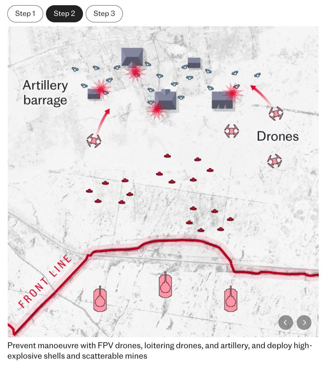 Потім росіяни б'ють безпілотниками FPV або роблять скидання з дронів, щоб ще більше обмежити пересування та відрізати шляхи відступу.