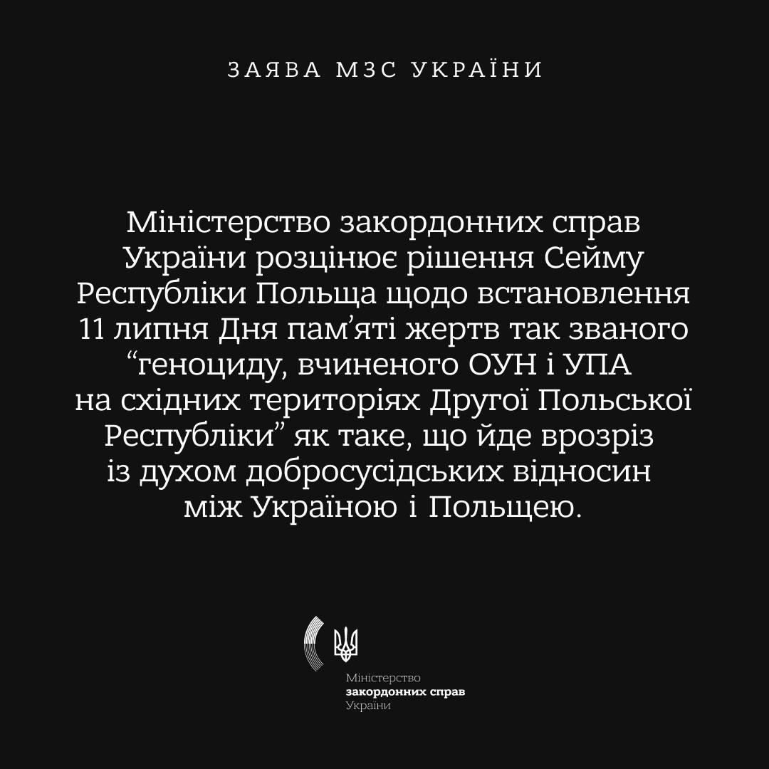 При цьому в Міністерстві закордонних справ України заявили, що рішення про встановлення дати "суперечить духу добросусідських відносин між Україною та Польщею", а також "не сприяє досягненню порозуміння та примирення".