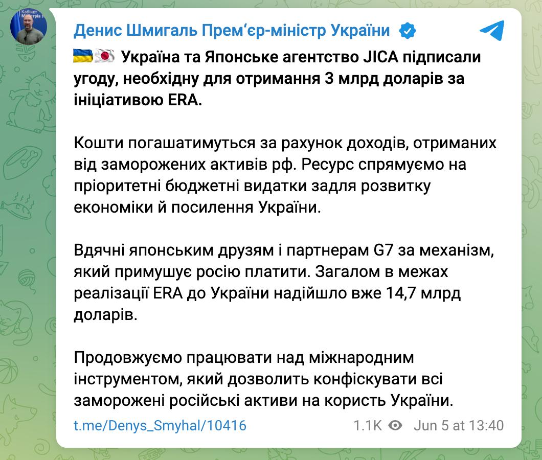 "Усього в рамках реалізації ERA в Україну надійшло вже 14,7 млрд доларів. Продовжуємо працювати над міжнародним інструментом, який дозволить конфіскувати всі заморожені російські активи на користь України", - додав прем'єр.