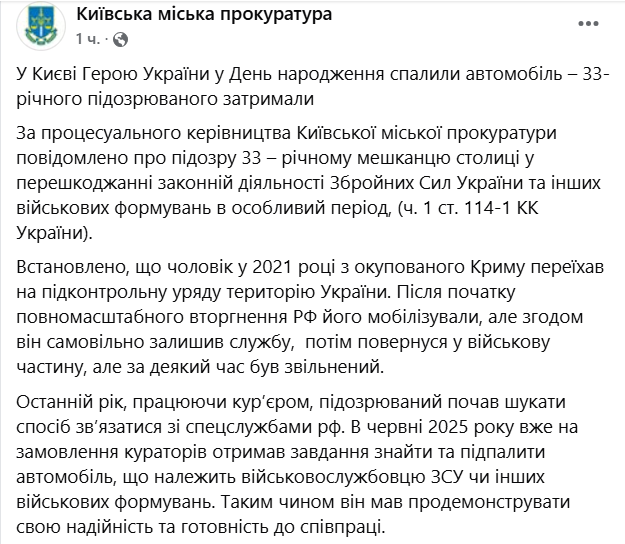 У Києві колишній військовий спалив автомобіль Героя України у його день народження. Про це повідомляє пресцентр Київської міської прокуратури.