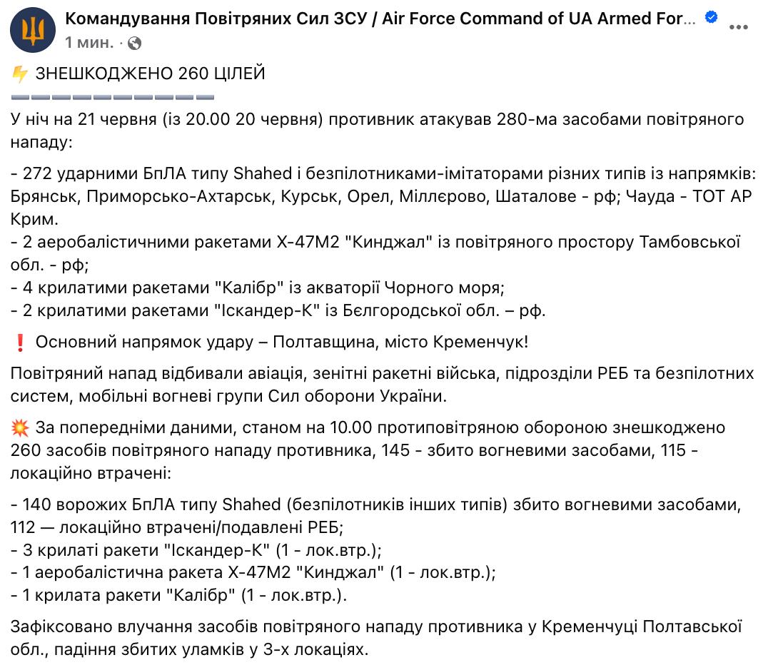 - 272 дрони Shahed та безпілотники-імітатори (140 збиті, 112 придушені засобами РЕБ).