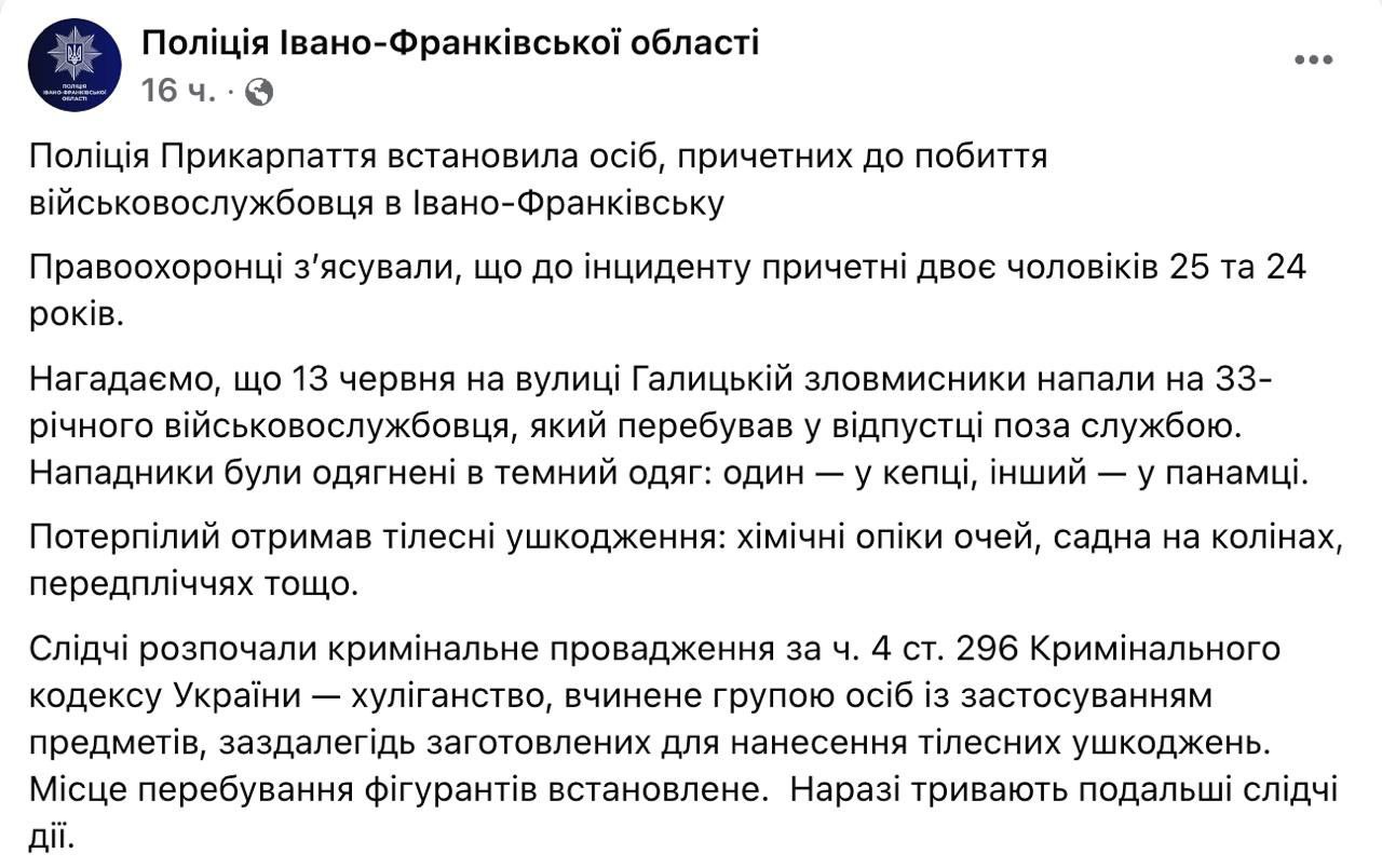 Поліція Івано-Франківської області підтвердила факт нападу на військового, який перебував у відпустці. Як сказано в прес-релізі поліції, у нього зафіксовано хімічні опіки очей, садна на колінах та передпліччя.