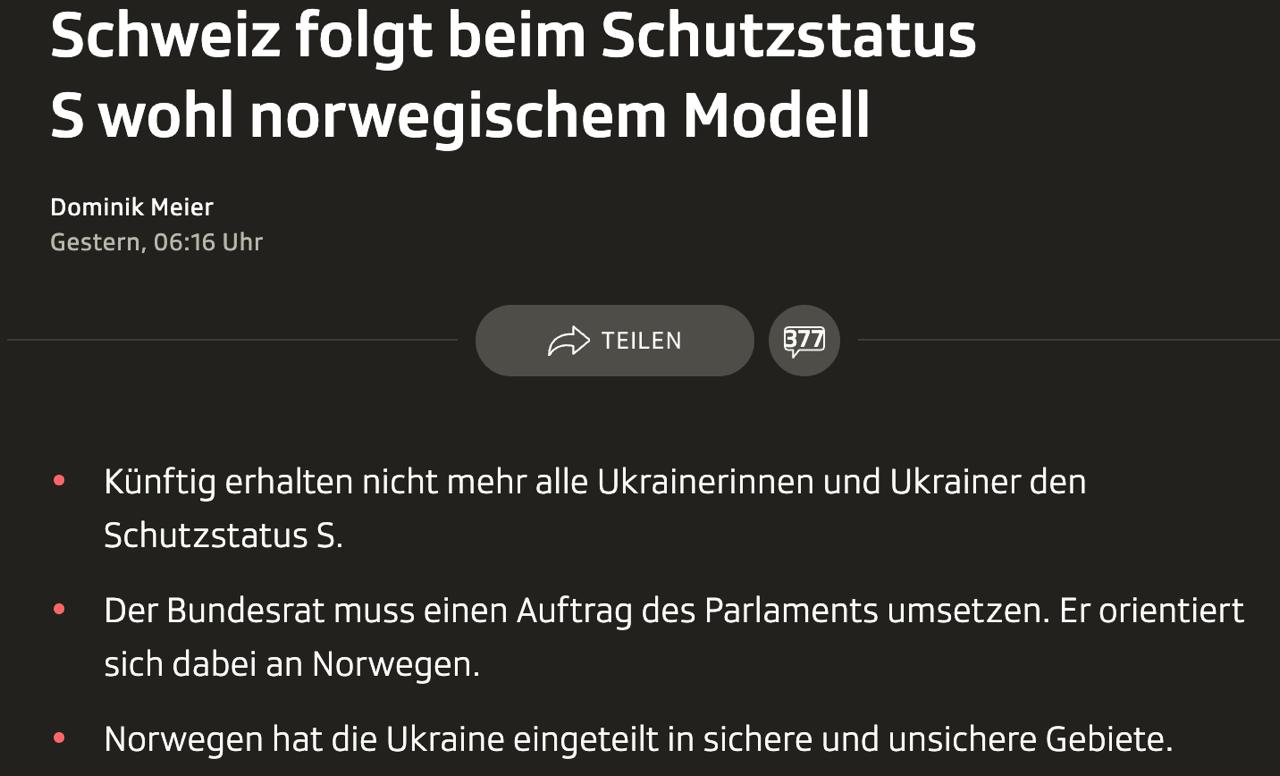 Нагадаємо, раніше Швейцарська народна партія (ШНП) внесла до Національної ради пропозицію посилити надання статусу захисту S для українських біженців, аргументуючи це тим, що ситуація на значній частині території України стабілізувалася і там немає бойових дій.