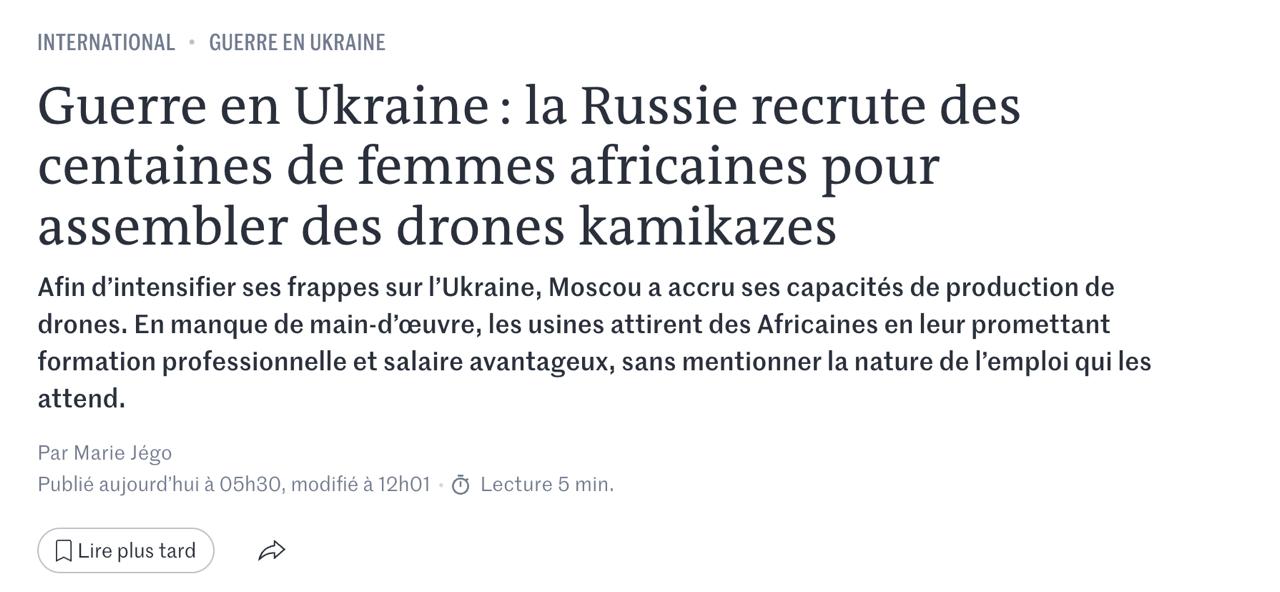 При цьому збираються вони в Татарстані руками сотень молодих африканських жінок, переважно з Уганди, Малі, Камеруну, Сьєрра-Леоне, Ботсвани, Зімбабве, Уганди та Південного Судану. Їм обіцяють зарплату 426-681 євро, що значно вище, ніж на батьківщині, і "унікальну можливість змінити хід життя". Що саме вони вироблятимуть, їм наперед не повідомляють.
