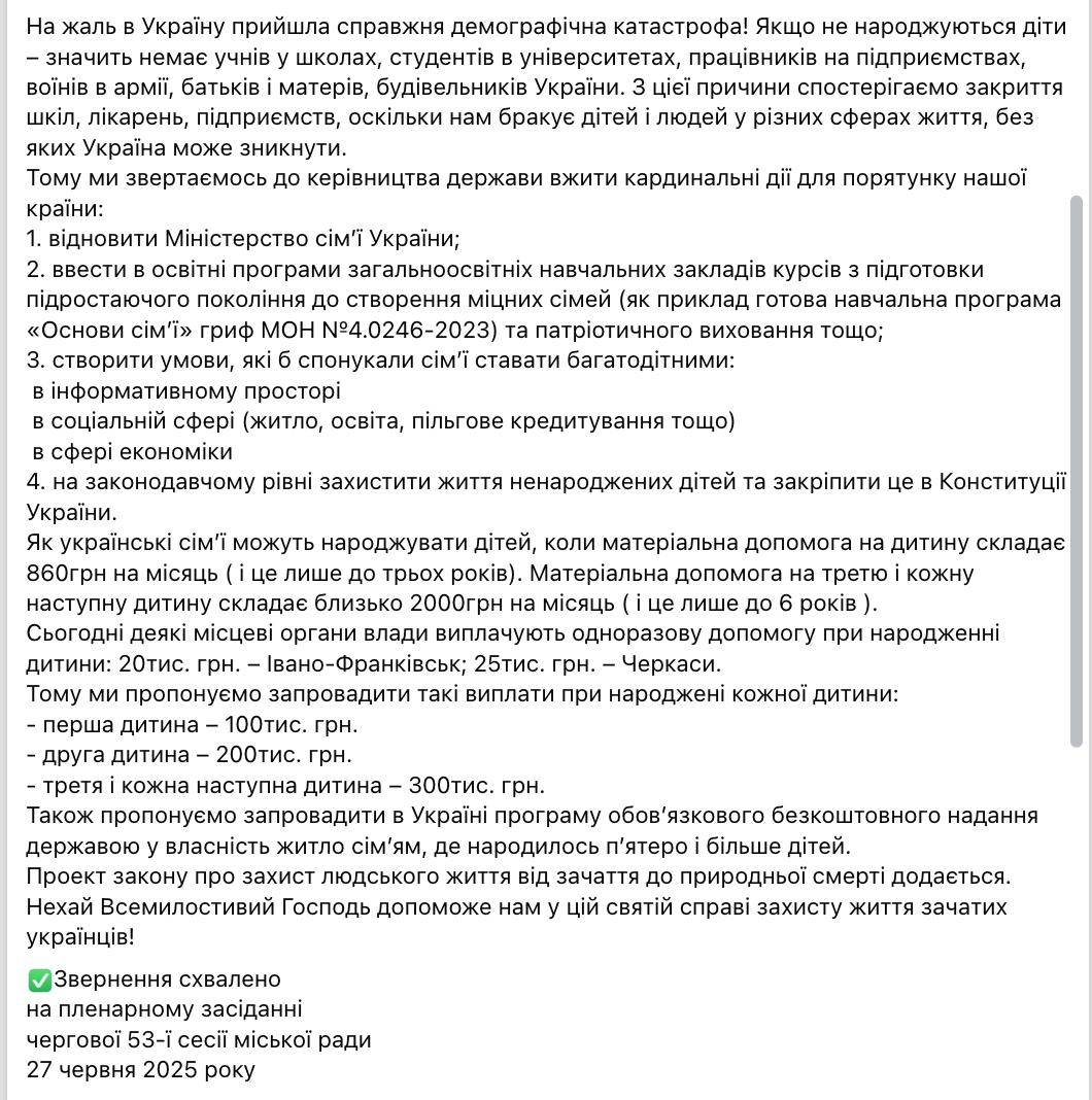 У зверненні також зазначено вкрай низьку виплату при народженні дітей, яка становить 860 гривень на місяць та надається лише до трьох років. Депутати вказують на необхідність платити по 100 тисяч гривень за першу дитину, по 200 тисяч - за другу та по 300 тисяч - за третю та всіх наступних дітей.