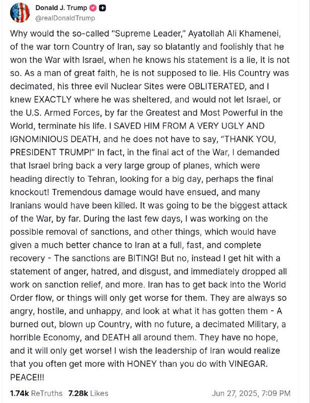 "Чому так званий верховний лідер аятола Алі Хаменеї, керівник розірваної війною країни Іран, так відверто і безглуздо заявляє, що виграв війну з Ізраїлем, хоча сам чудово знає, що це брехня, це не так? Як людина глибокої віри вона не повинна брехати. Його країна була зруйнована. знав, де він ховався, але не дозволив Ізраїлю або Збройним силам США – безумовно, найбільшим і найпотужнішим у світі – ліквідувати його.