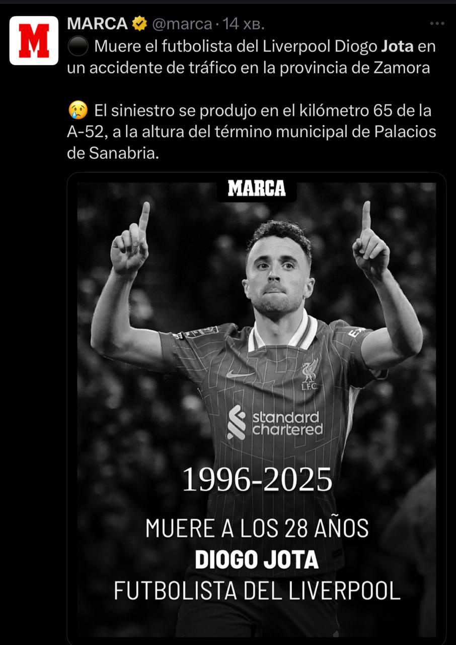 "Футбольний клуб Ліверпуль глибоко засмучений новиною про трагічну смерть Діогу Жоти. Клуб отримав підтвердження, що 28-річний гравець та його брат загинули в автомобільній аварії в Іспанії", - йдеться у повідомленні на офіційному сайті команди.