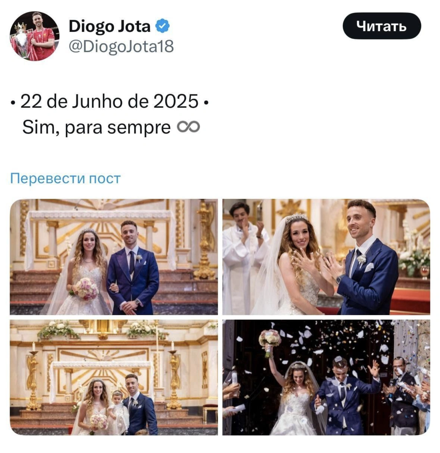 При цьому півтора тижні тому – 22 червня – Жота зіграв весілля з Руте Кардозу, від якого у нього троє дітей.