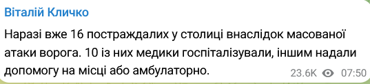 Мер Київ Віталій Кличко повідомив, що на даний момент відомо про 16 постраждалих, 10 з них госпіталізовані.