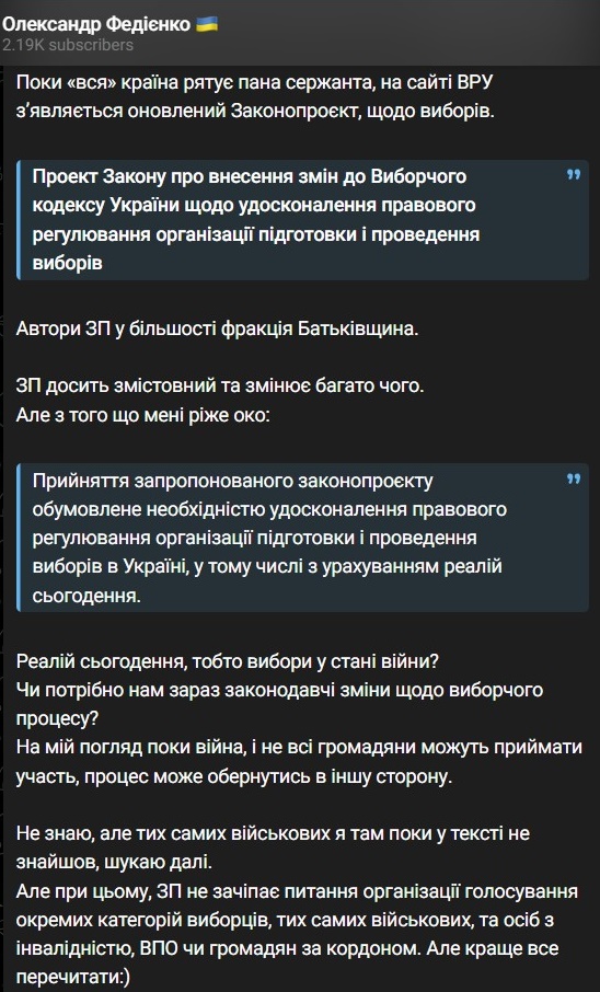 Поява такого законопроєкту вже породила припущення в соцмережах, що таким чином влада готується до виборів під час війни (або сподіваючись на її швидке закінчення).