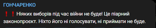 "Ніяких виборів під час війни не буде. Це піарний законопроєкт. Ніхто його ні голосувати, ні приймати не буде", - заявив нардеп Гончаренко.