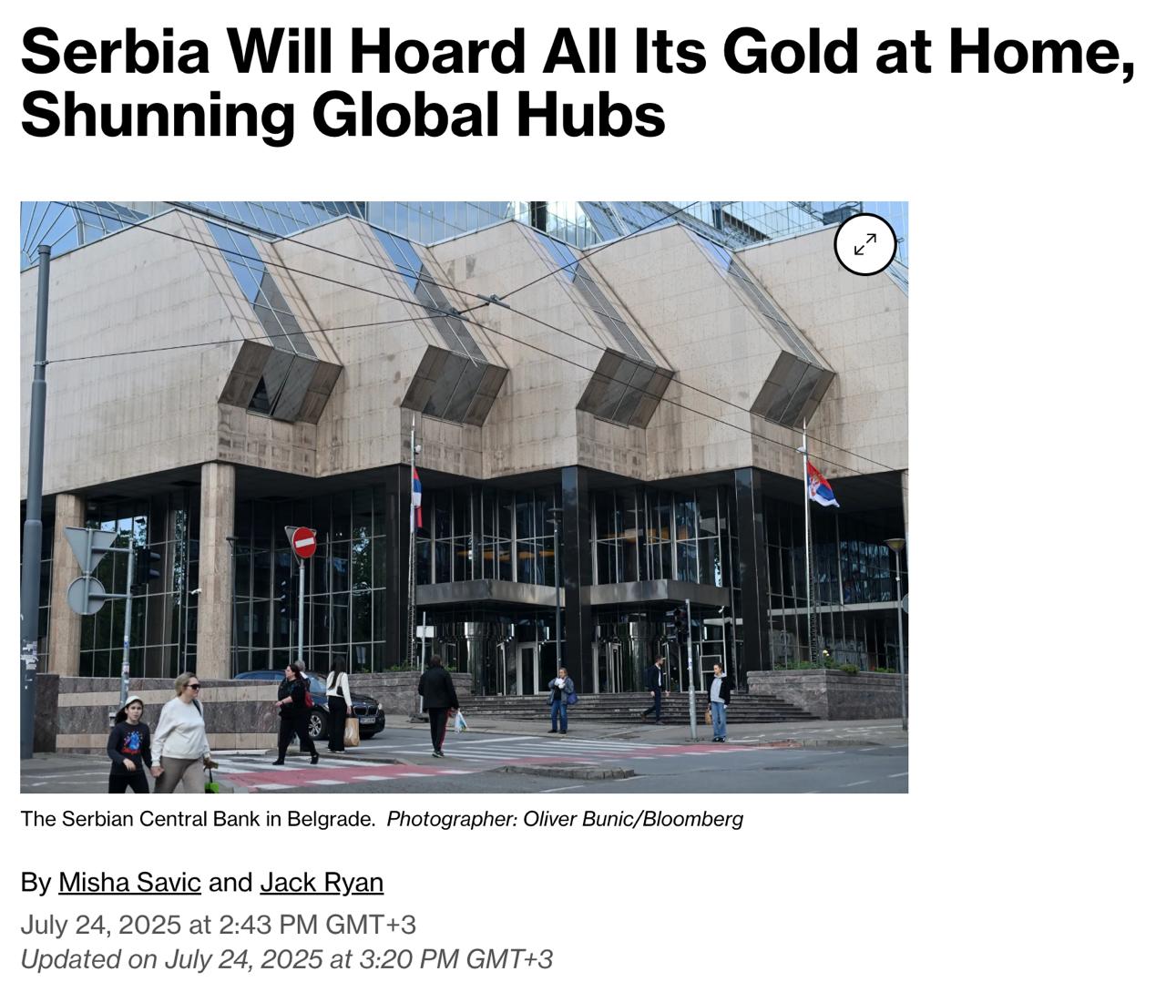 Центральний банк Сербії має намір перевести всі золоті резерви країни з-за кордону назад, щоб забезпечити їхню безпеку в період криз. Таким чином Сербія стане першою країною Східної Європи, яка зберігатиме свої золоті зливки вдома, а не у Швейцарії, Великій Британії чи США.
