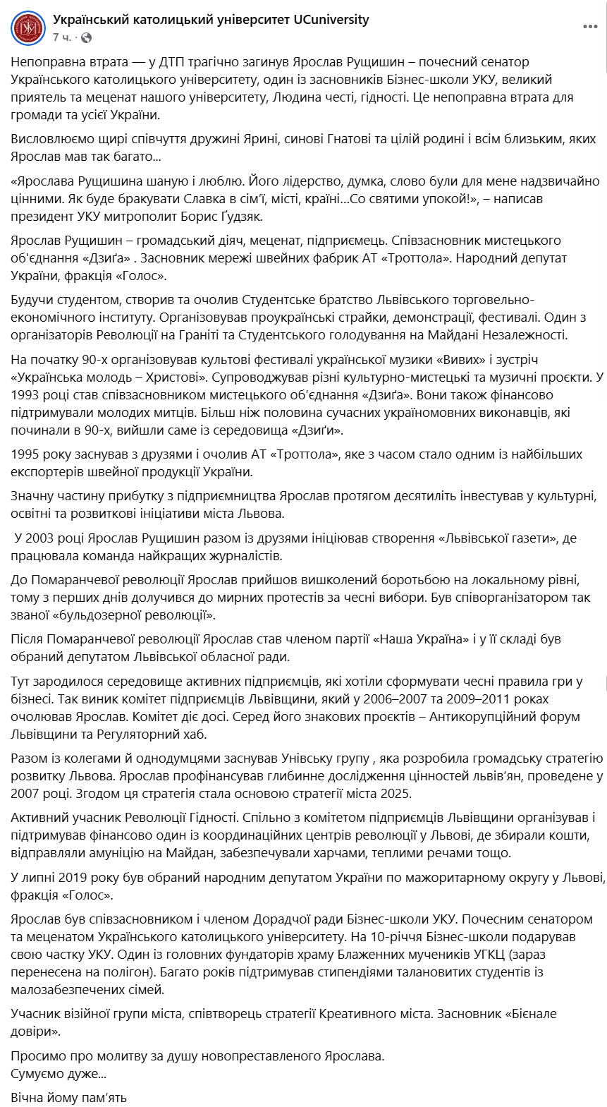 Рущишин був меценатом університету та одним із засновників Бізнес-школи УКУ.