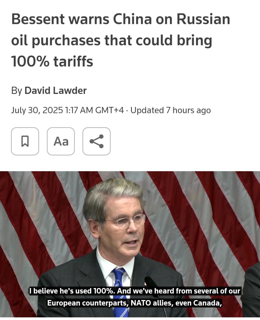 Як повідомив міністр фінансів США Скотт Бессант за підсумками вчорашніх переговорів, китайці у відповідь на пропозицію відмовитися від російської та іранської нафти сказали, що захищатимуть свій енергетичний суверенітет.