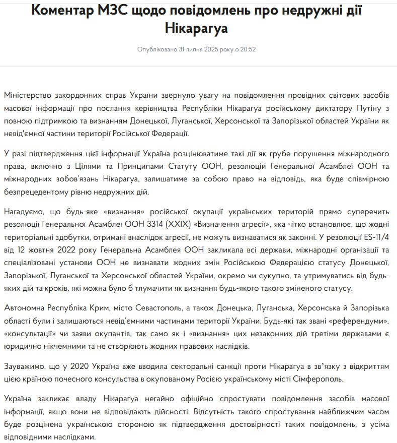 Міністерство закордонних справ України відреагувало на публікації в медіа про те, що Нікарагуа повідомила главу Кремля Володимира Путіна про "повне визнання" захоплених українських територій частиною Росії.