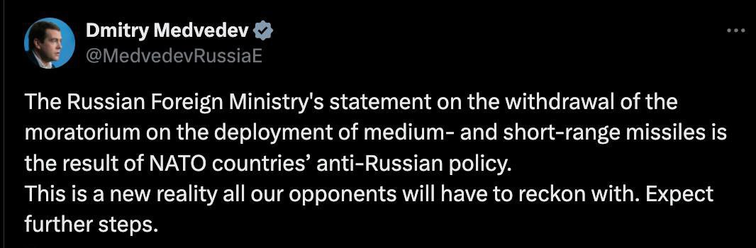 "Це нова реальність, з якою доведеться рахуватися всім нашим опонентам. Чекайте на подальші кроки", - написав Медведєв.