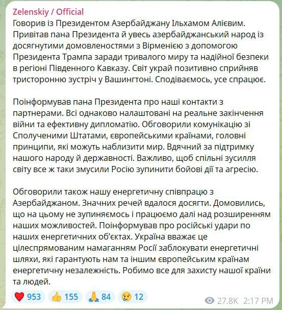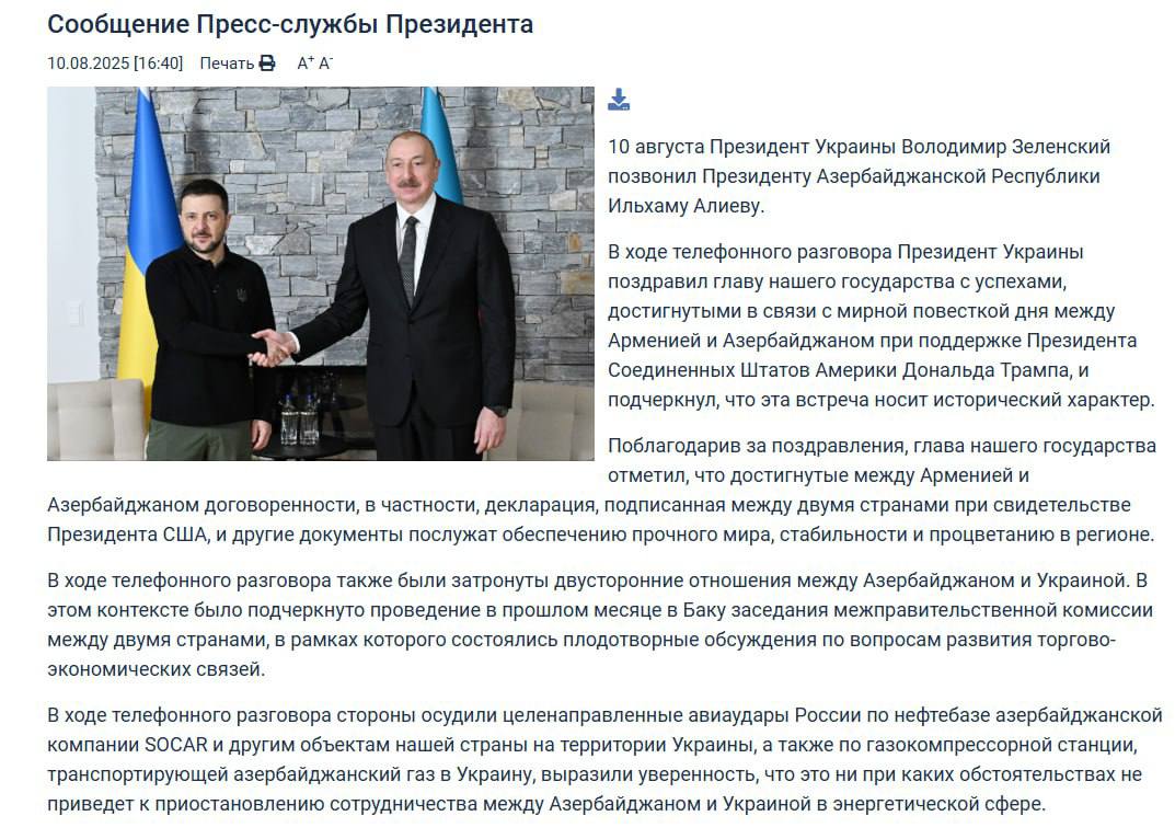 "Під час телефонної розмови сторони засудили завдані Росією цілеспрямовані повітряні удари по нафтобазі на території України, що належить компанії SOCAR Азербайджану, іншим об'єктам, що належать до нашої країни, а також по газокомпресорній станції, що транспортує азербайджанський газ в Україну, і підкреслили впевненість, що це ні в якому разі не буде. енергетики", - йдеться у заяві прес-служби Алієва.