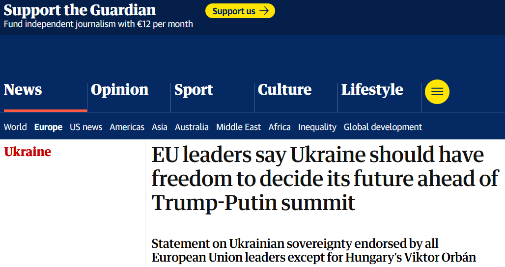 Євросоюз закликав Трампа враховувати інтереси Європи та України у переговорах із Путіним. Угорщина не підтримала