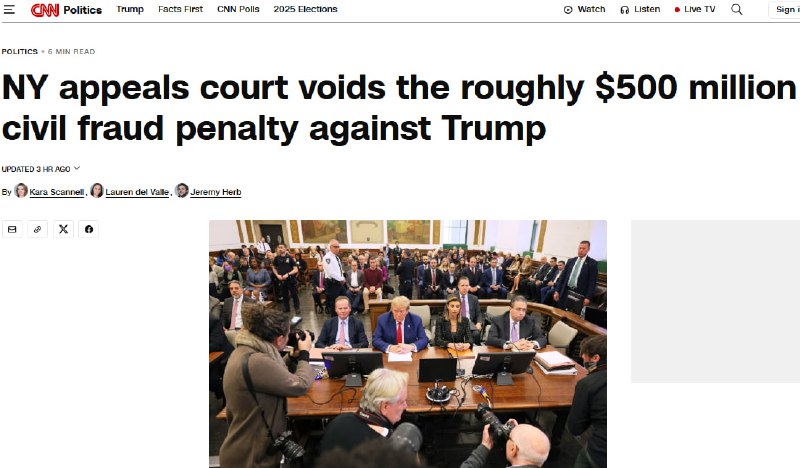 Апеляційний суд Нью-Йорка скасував рішення, яке зобов'язувало президента США Дональда Трампа виплатити великий штраф у розмірі 515 мільйонів доларів у справі про шахрайство через завищення оцінки активів компанії Trump Organization.
