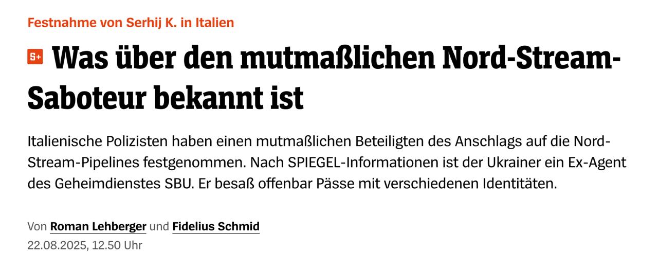 Der Spiegel наводить інформацію, яка вже фігурувала в пресі: підрив нібито здійснила група українських спецназівців та цивільних під командуванням колишнього українського розвідника Романа Червінського зі схвалення українського військового керівництва.