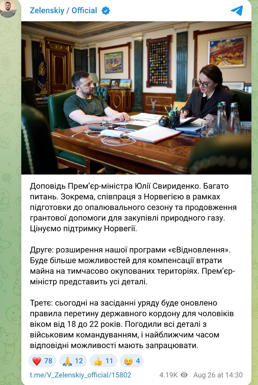 "Сьогодні на засіданні уряду буде оновлено правила перетину державного кордону для чоловіків віком від 18 до 22 років. Узгодили всі деталі з військовим командуванням, і найближчим часом мають запрацювати відповідні можливості", - пише Зеленський.