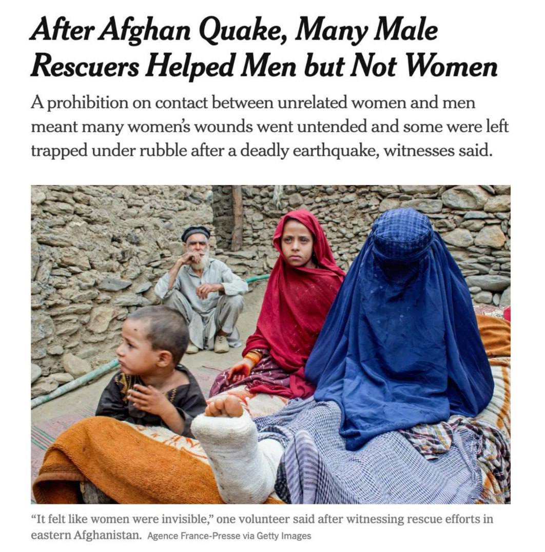 У публікації йдеться, що через суворі норми "Талібану", які забороняють будь-який фізичний контакт між чоловіками та жінками, які не є членами сім'ї, рятувальники ігнорували жінок, які опинилися під завалами.