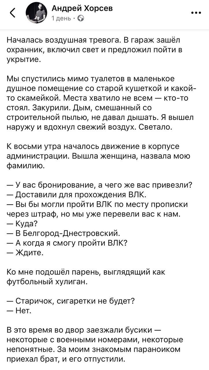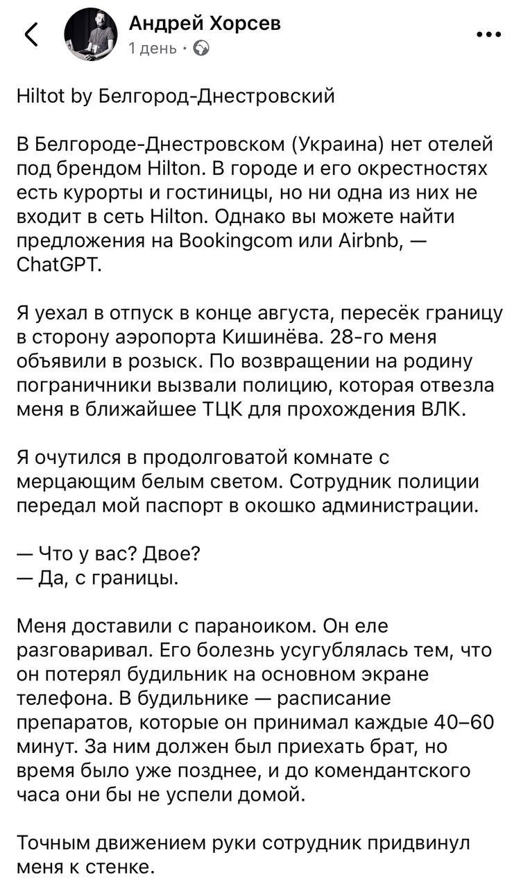 "Я поїхав у відпустку наприкінці серпня, перетнув кордон у бік аеропорту Кишинева. 28-го мене оголосили в розшук. Після повернення на батьківщину прикордонники викликали поліцію, яка відвезла мене до найближчого ТЦК для проходження ВВК", – розповів у Фейсбуці підприємець Андрій Хорсєв.
