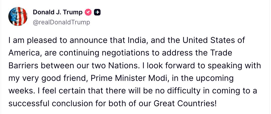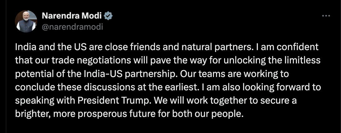 "З нетерпінням чекаю розмови зі своїм дуже добрим другом, прем'єр-міністром Моді, найближчими тижнями. Упевнений, що не виникне жодних труднощів у досягненні успішного висновку, вигідного для обох наших Великих країн", - написав президент США.
