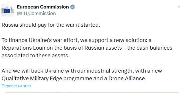 "Для фінансування військових зусиль України ми підтримуємо нове рішення: репараційний кредит на основі російських активів - залишків готівки, пов'язаних із цими активами", - цитує ЄК свою главу Урсулу фон дер Ляйєн.