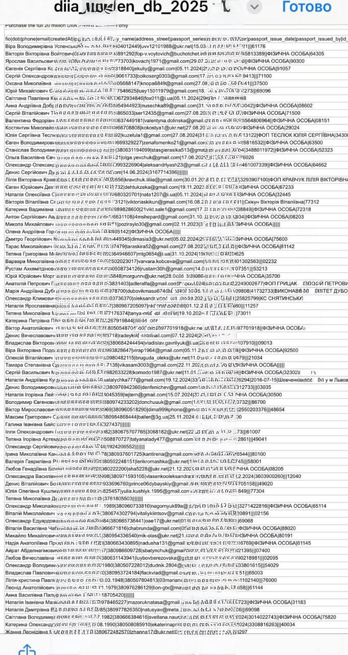 В Україні стався масштабний витік персональних даних на 20 мільйонів людей. Файл під назвою "diia_users_db_2025" (з натяком, що витік стався з "Дії") пропонується в Мережі за гроші.