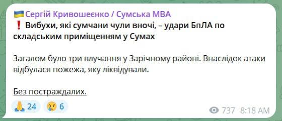 Також цієї ночі був приліт об'єктом інфраструктури у Ніжині Чернігівської області, через що виникла серйозна пожежа.