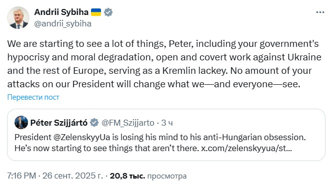"Ми починаємо бачити багато чого, Петер, включаючи лицемірство та моральне падіння вашого уряду, його відкриту та приховану роботу проти України та всієї Європи, його підлабузництво перед Кремлем. Жодні ваші нападки на нашого президента не змінять того, що бачимо ми – і всі інші", – написав глава МЗС України.