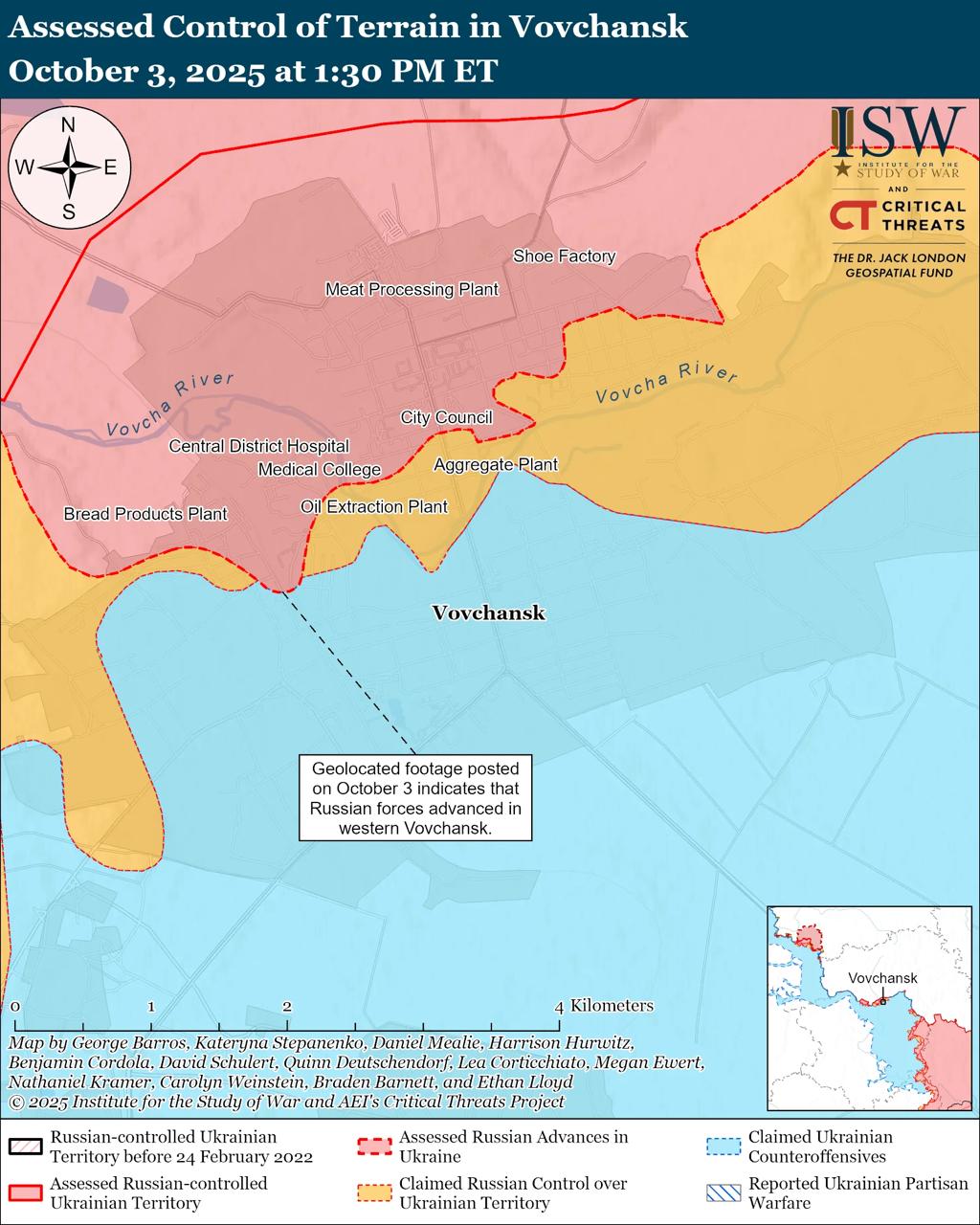 "Геолокаційні кадри, опубліковані 3 жовтня, вказують, що російські сили нещодавно просунулися вздовж Південної залізниці у західній частині Волчанська та захопили Вовчанський залізничний вокзал", - йдеться у зведенні "Інституту".