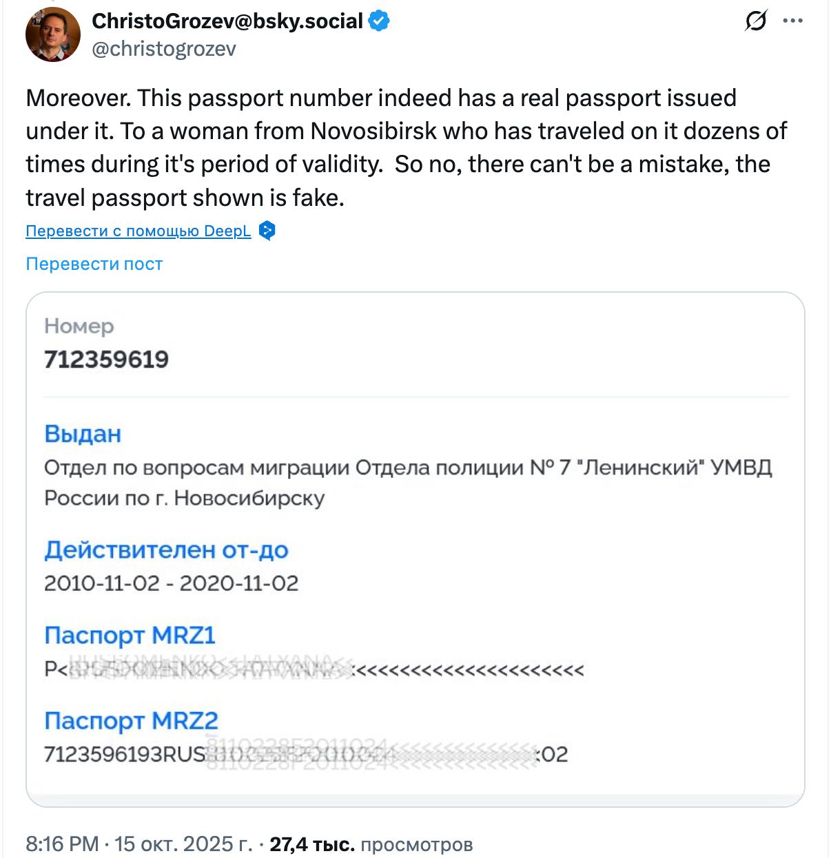 Він зазначив, що зазначений у матеріалах СБУ номер насправді є номером паспорта жінки з Новосибірська, яка подорожувала ним десятки разів протягом терміну його дії.