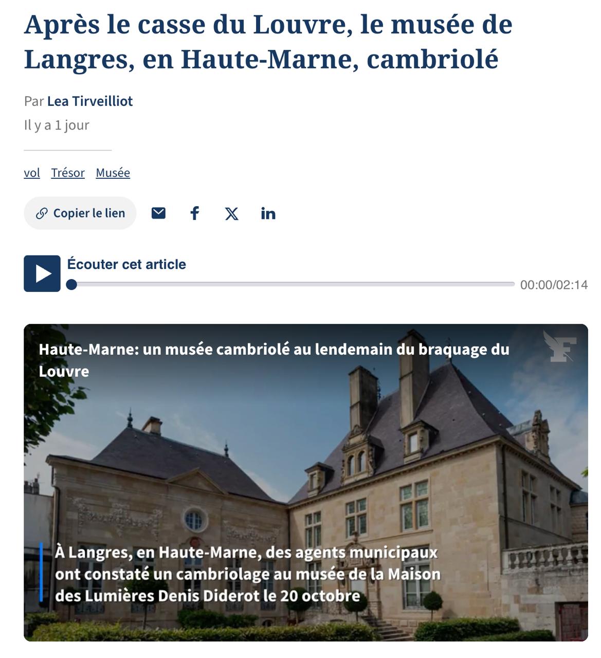 Наступного дня після гучної крадіжки у Луврі невідомі пограбували ще один французький музей - Будинок освіти Дені Дідро, присвячений спадщині великого французького філософа та розташований у місті Лангр (департамент Верхня Марна).