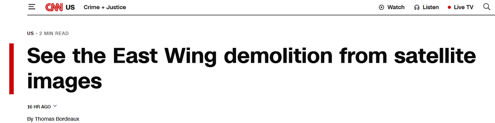 Супутникові знімки, зроблені вранці в четвер, показують ділянку, де раніше розташовувалося східне крило — будинок, де традиційно знаходився офіс першої леді США.