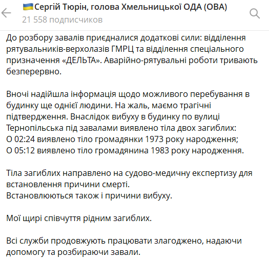 Про це повідомив у своєму телеграм-каналі голова Хмельницької обласної військової адміністрації Сергій Тюрін.