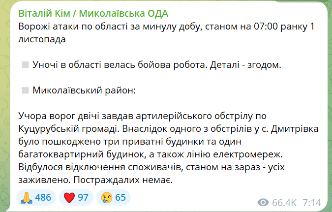 "Внаслідок ракетного удару по Миколаєву є поранені. Служби працюють", - зазначив Кім.